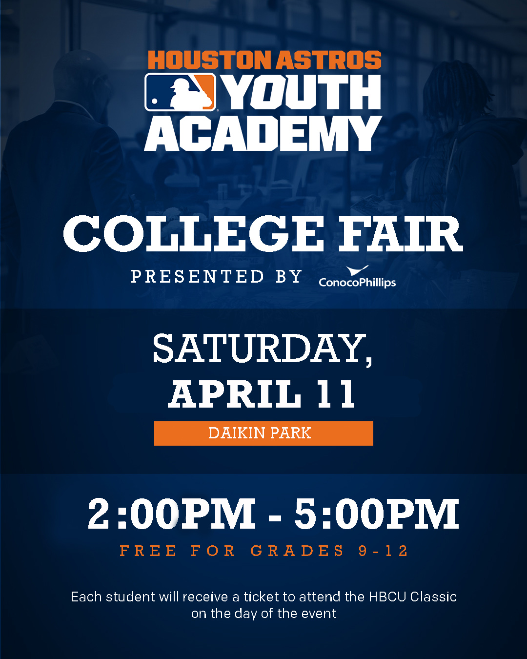 The Astros Foundation and Astros Youth Academy will be hosting a college fair presented by ConocoPhillips on Saturday, April 11, 2026 from 2:00 p.m. - 5:00 p.m. at Daikin Park.