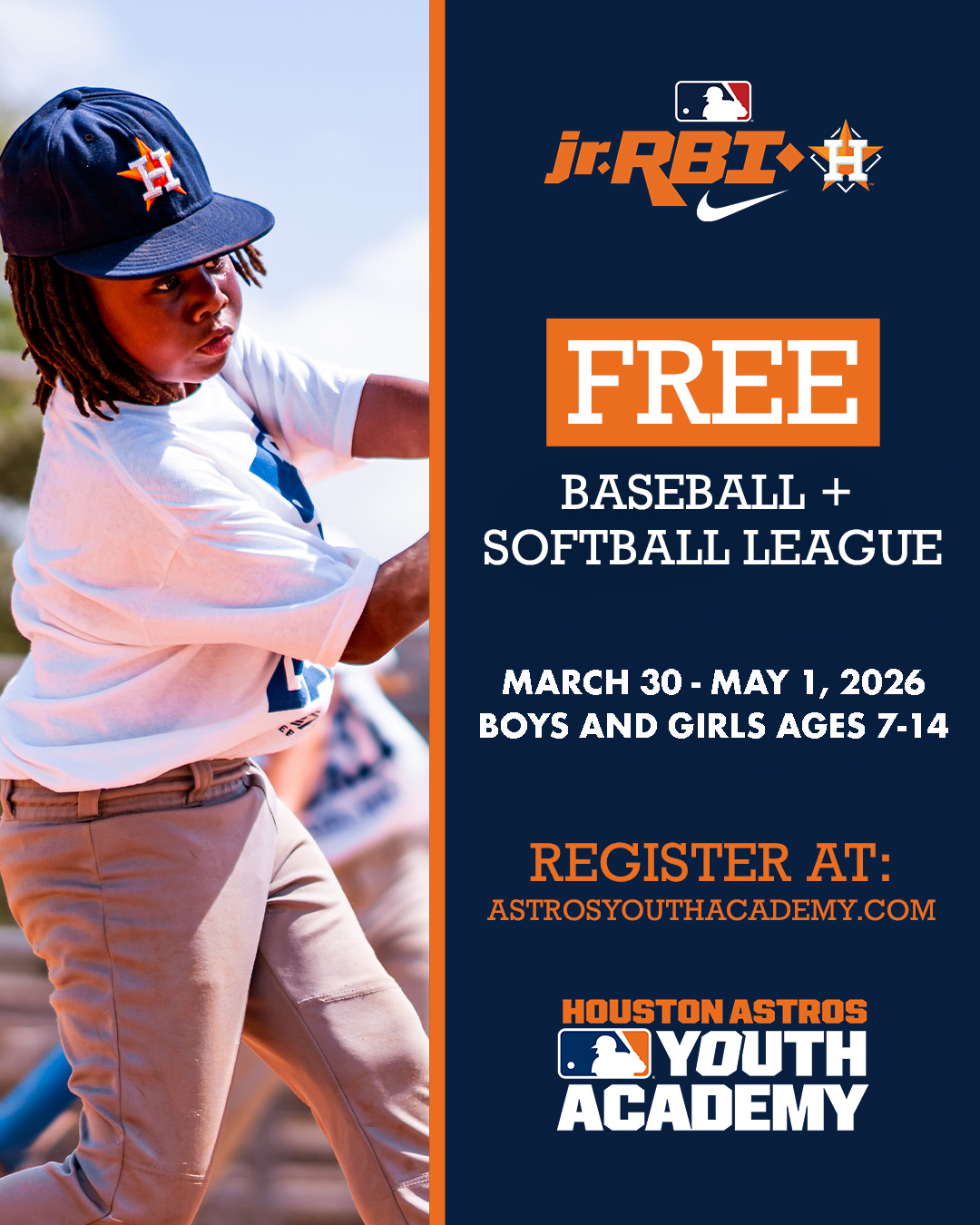 The Astros Nike Jr. RBI League is set to begin the week of March 30, 2026 and conclude on May 1, 2026. The FREE league is a baseball/softball league for boys and girls ages 7-14 at the Houston Astros Youth Academy (AYA) located at Sylvester Turner Park. The league will be directed by the Houston Astros AYA Staff. Please use the attached link to register for the league.